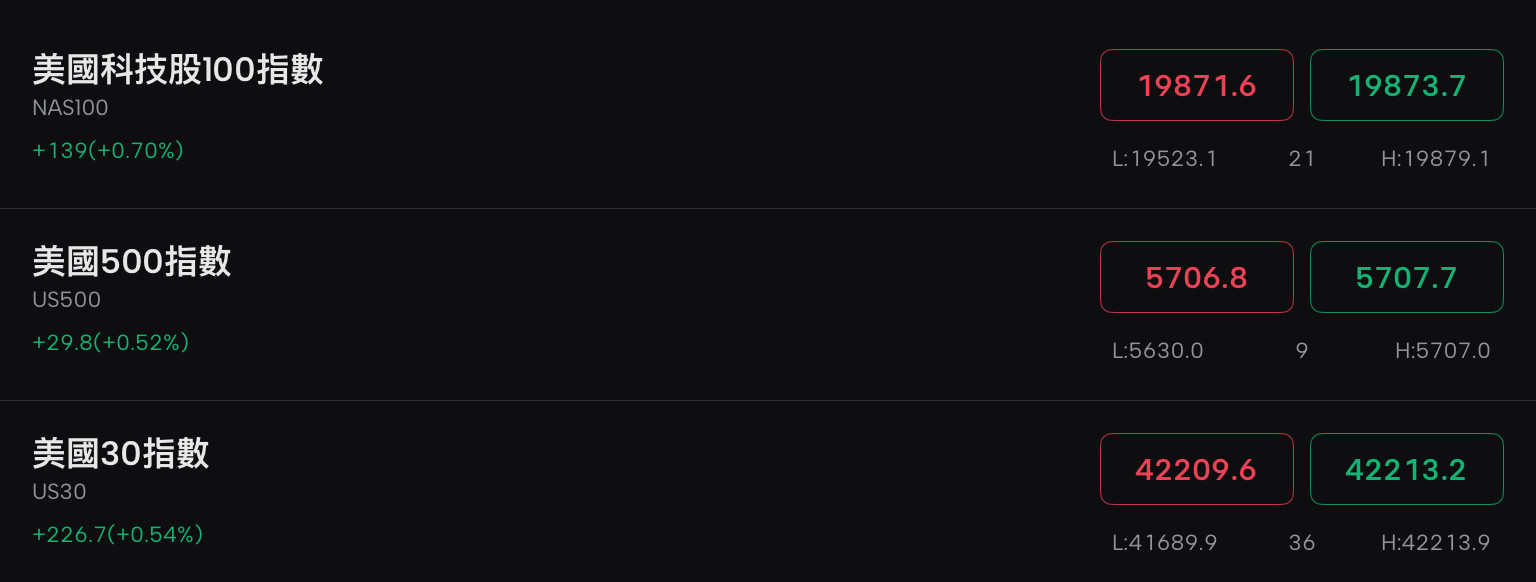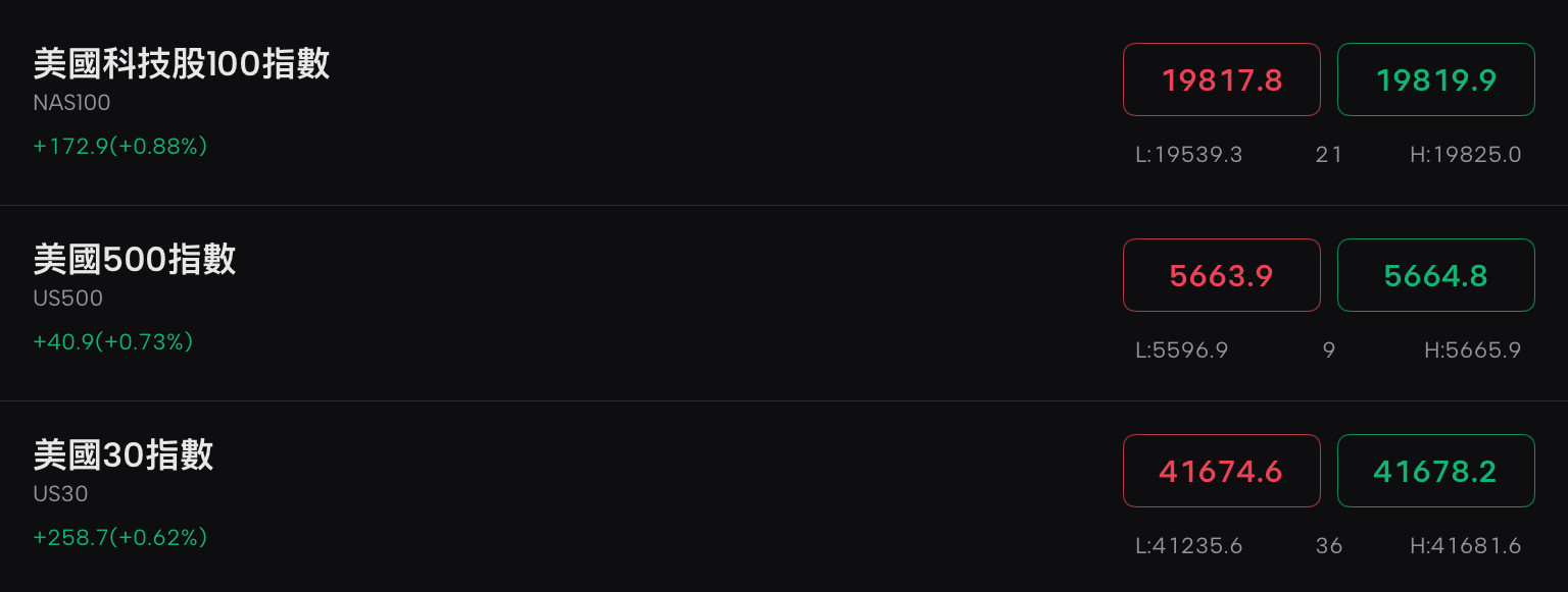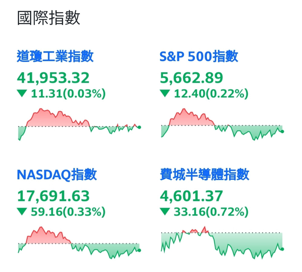 三大指數期貨表現:道指期貨下跌173點(0.41%)至42,157點;標普500期貨下跌27.5點(0.48%)至5,702.25點;納指期貨下跌123.25點(0.62%)至19,827.75點