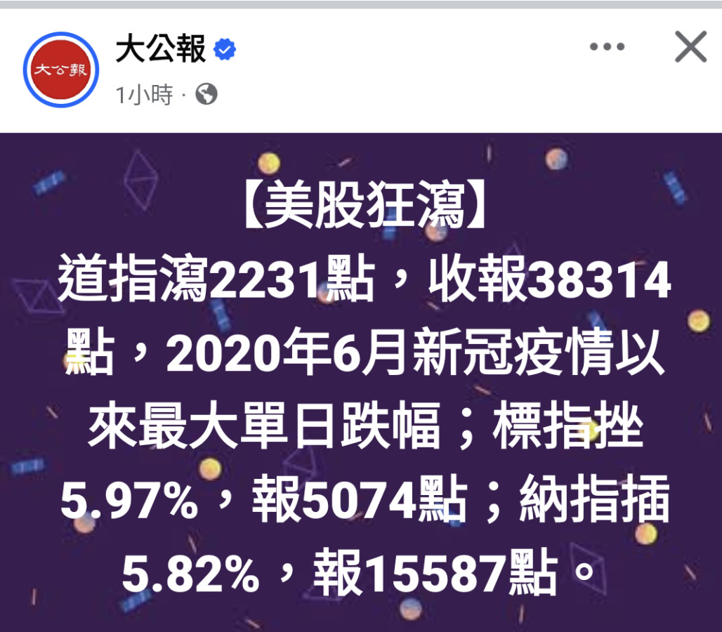 回覆 LAMDA:美指現跌超過2000點,三天合計跌超過五...