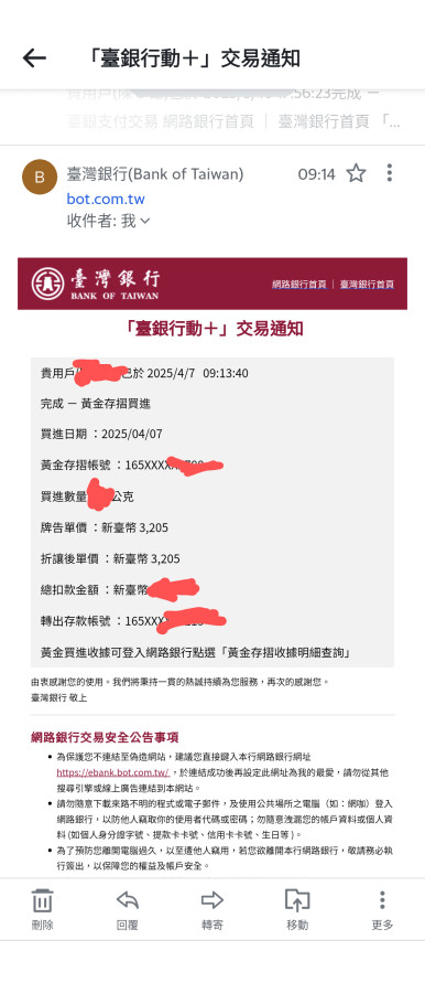 回覆 雄大:上星期六買實體黃金今天繼續買黃金存摺台幣...