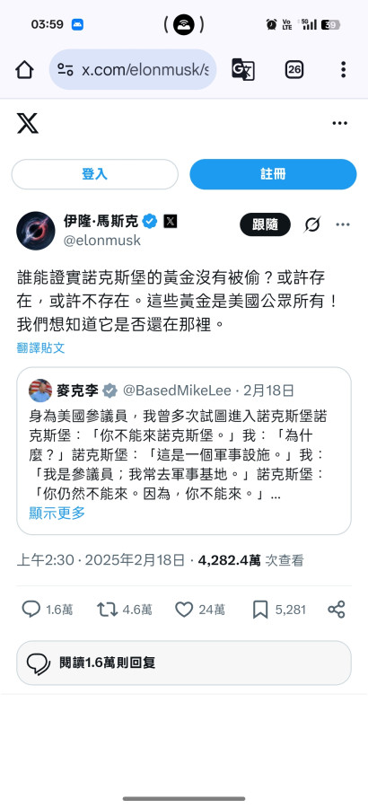 回覆 Oppa0802:連“馬斯克”都懷疑美國諾克斯堡裡黃金有少...