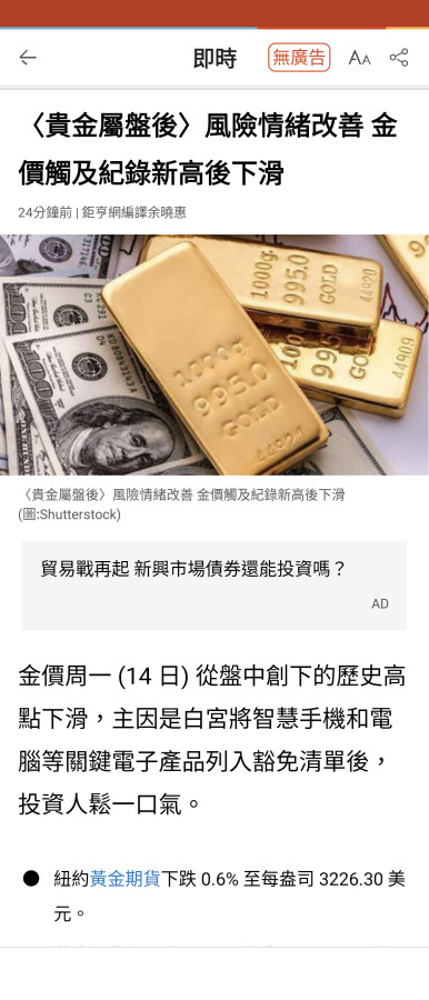 〈貴金屬盤後〉風險情緒改善 金價觸及紀錄新高後下滑