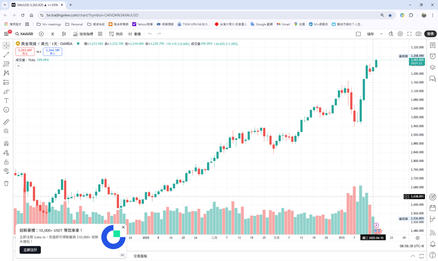 昨天還在想黃金要加碼嗎?今天看怎又漲上去了,也拉回太少吧?