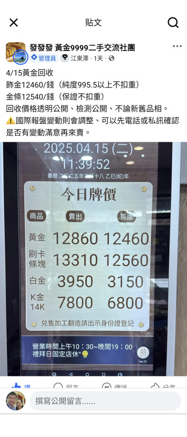 回覆 雄大:黃金存摺差價越來越大台幣計價下午3點半4...