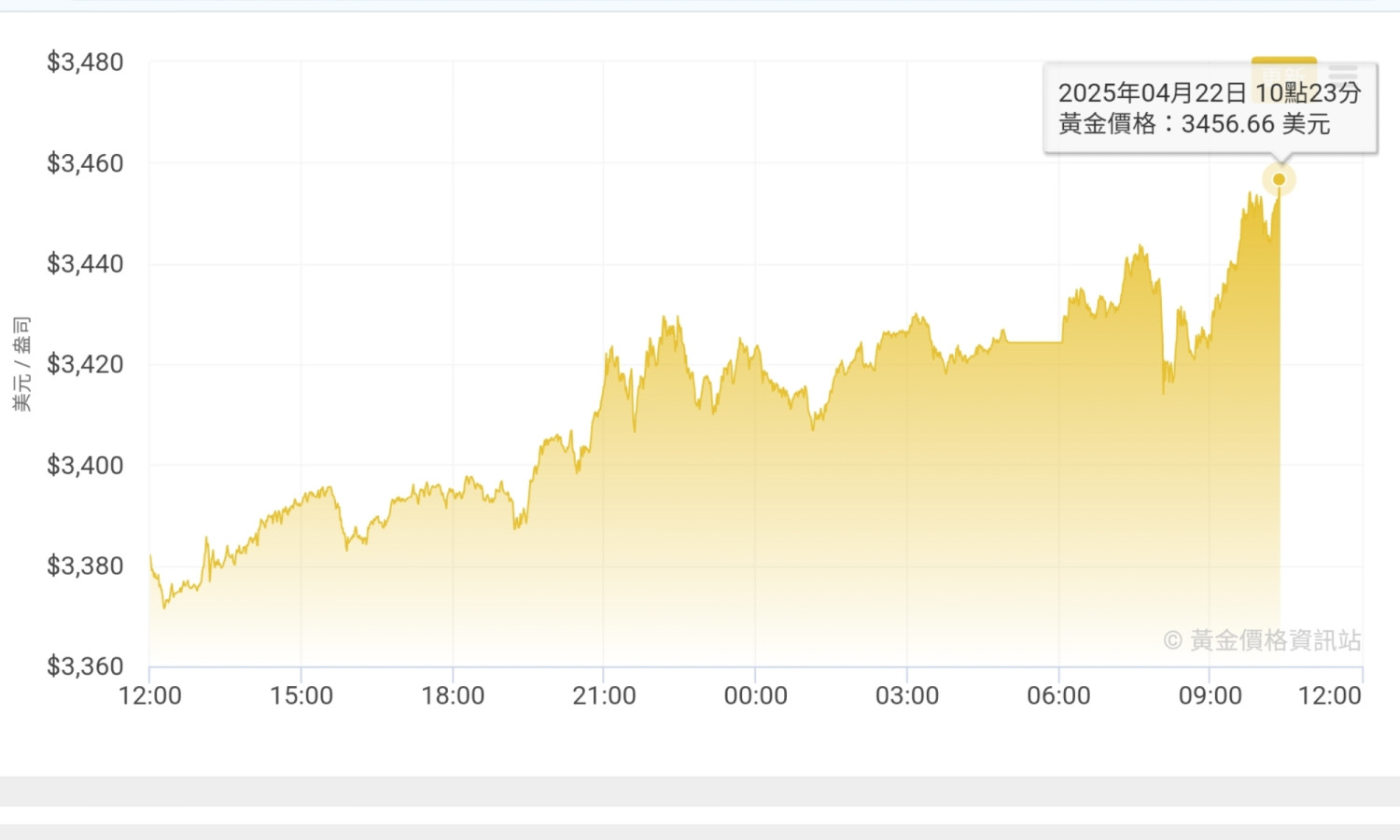 截至2025年4月22日,國際金價持續創下新高,主要受到美中貿易緊張、美元走弱、通膨壓力以及地緣政治風險等因素影響。根據最新報導,金價已突破每盎司3,430美元,年初至今漲幅接近30%。此外,市場預期金價可能進一步挑戰每盎司3,500美元的關卡。