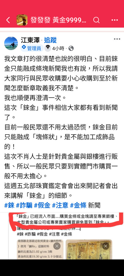 錸金恐慌症 這錸熔點很高 要作成飾金 難度太大 我看 圖這就是掏寶貨 什麽南非錫金 越南沙金之類的假金 銀樓的火槍燒後現形啊 !