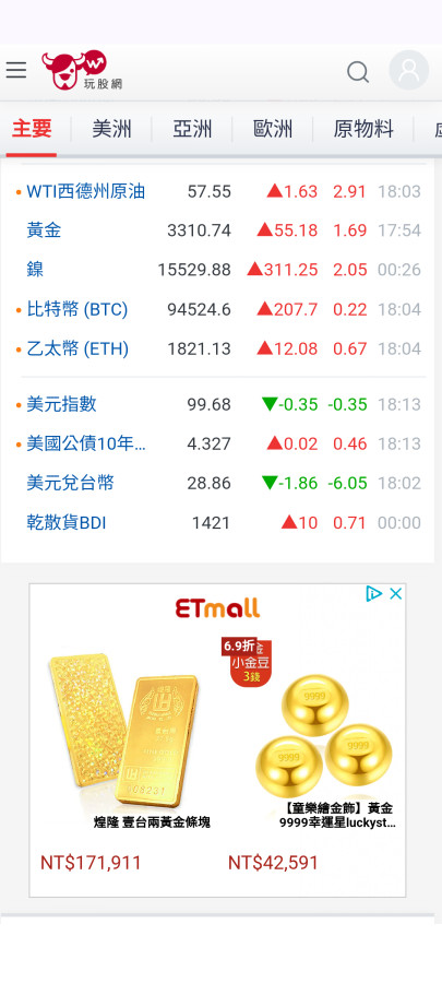 要看鉅亨網的 金價上3300,可惜匯率害台幣金價大概一錢少1000以上