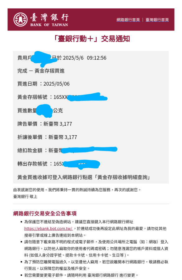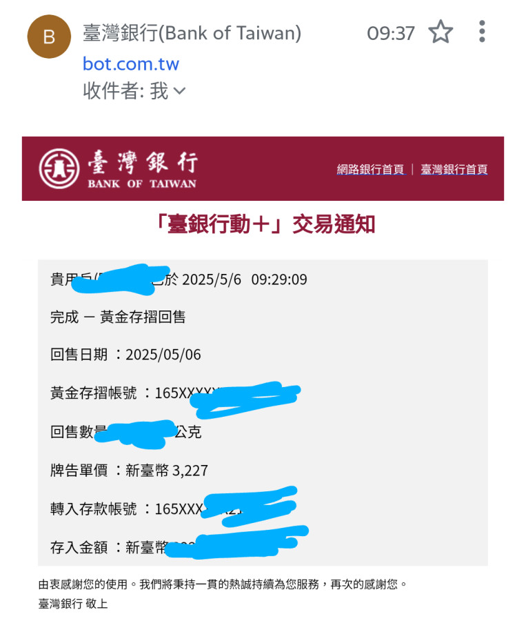 回覆 雄大:昨天收盤央行護盤30點多台幣黃金存摺開盤...