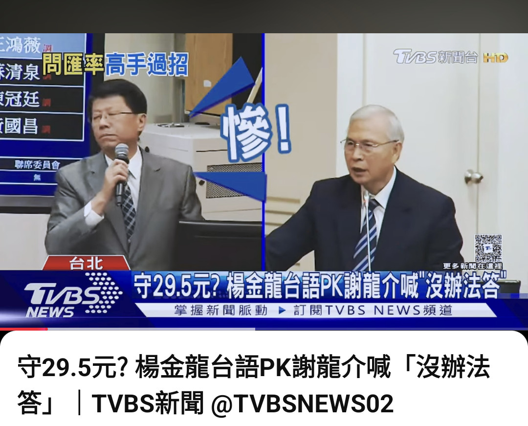下次沒有意外 楊半嗎又說,台幣匯率 28元 跟 27,5 元也沒有差,在下下次又說 台幣匯率 27元 跟 26,5元也沒差,台幣匯率 糊理糊塗 就這樣升值了•••