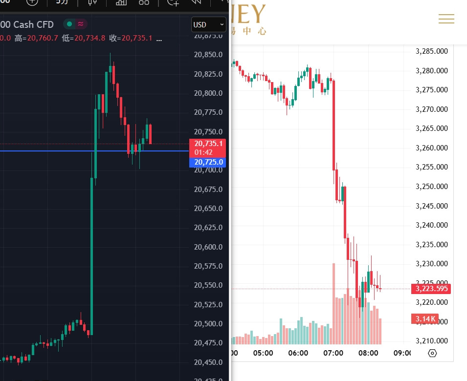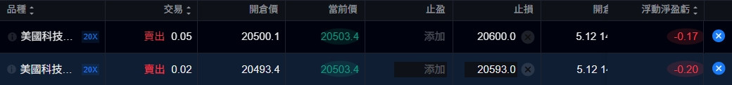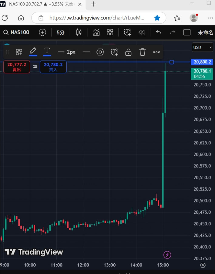 目前納指漲了2.13%(+450點), 小弟恐高, 先在20500做空一點點(帶止損), 看看會不會滑落