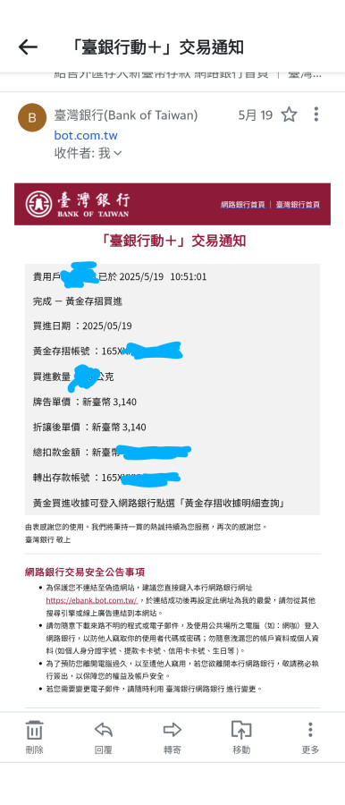 我一早去台銀吹冷氣😅,看到好價剛好帳上還有點錢就買了50克!👍支持閒錢囤金