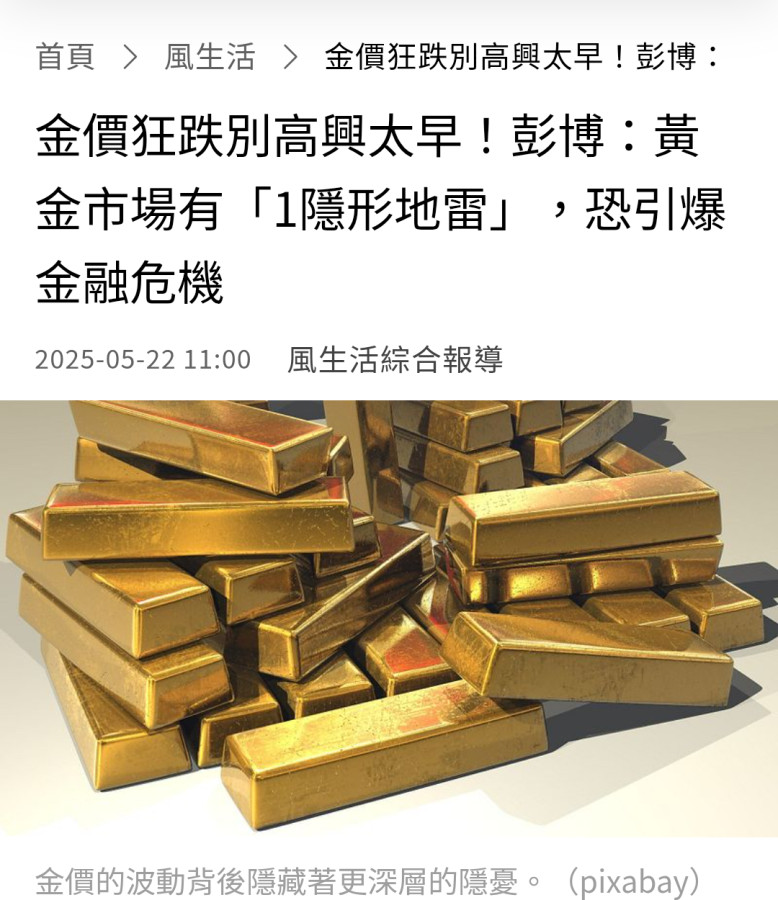下面的新聞都是黃金利多,黃金交易98%是數字黃金,只有2%是實體黃金,萬一發生危機擠兌,根本沒那麼多黃金,會不會變成紙黃金一兩一萬,實體黃金一兩價格百萬