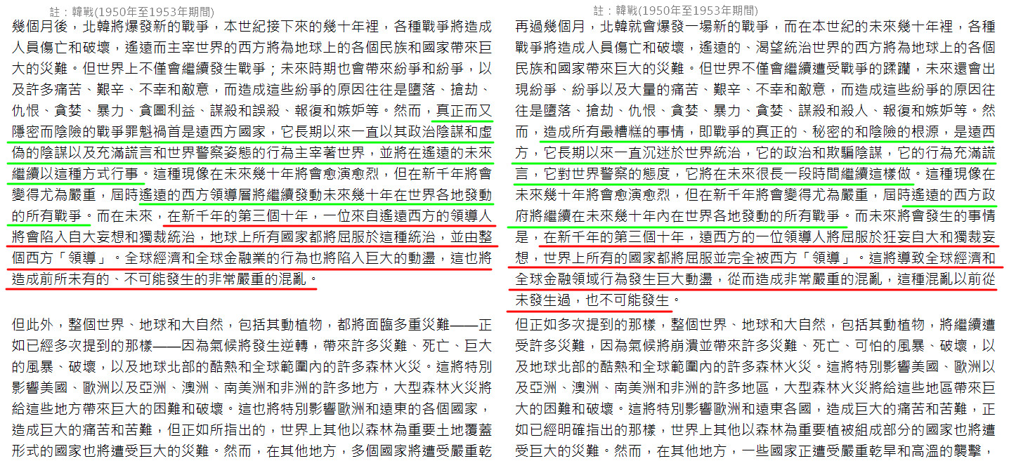 比利邁爾:『...在新千年的第三個十年,遠西方的一位領導人將屈服於狂妄自大和獨裁妄想,世界上所有的國家都將屈服並完全被西方「領導」。這將導致全球經濟和全球金融領域行為發生巨大動盪,從而造成非常嚴重的混亂,這種混亂以前從未發生過,也不可能發生。』