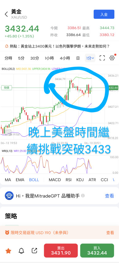 回覆 雄大:亞盤早上突破3433但是沒有站穩每盤晚上...