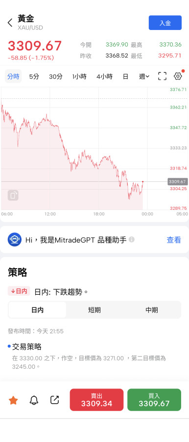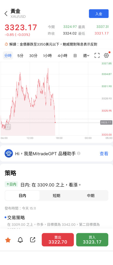 回覆 雄大:昨晚收盤3324黃金下跌到3295反彈實...