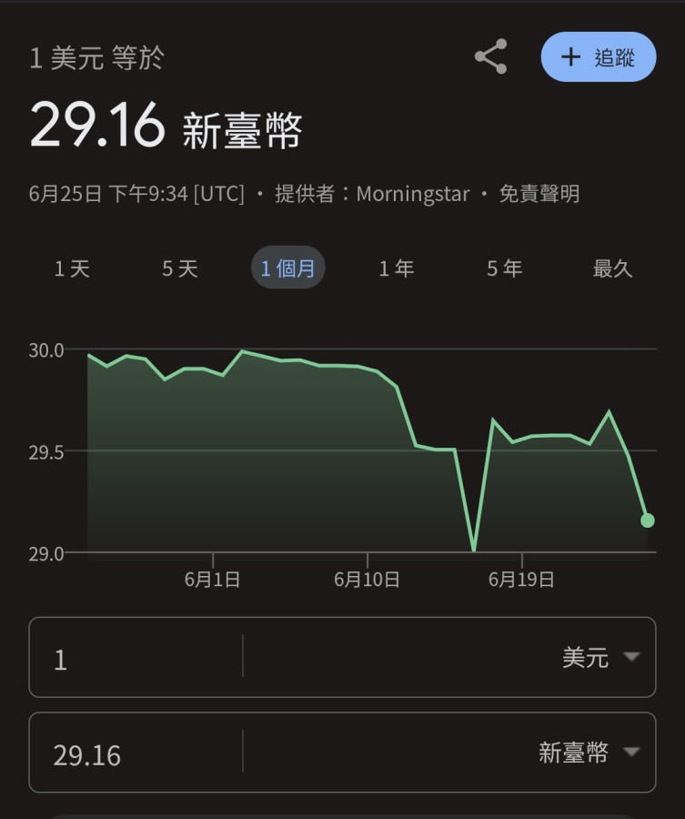在美國偷襲伊朗後,台幣匯率在週一曾短暫貶至29.6x,隨即以伊美又談和,台幣再度強升至今,已升破29.3來到29.29x,再來即將邁向29.1挑戰28。
