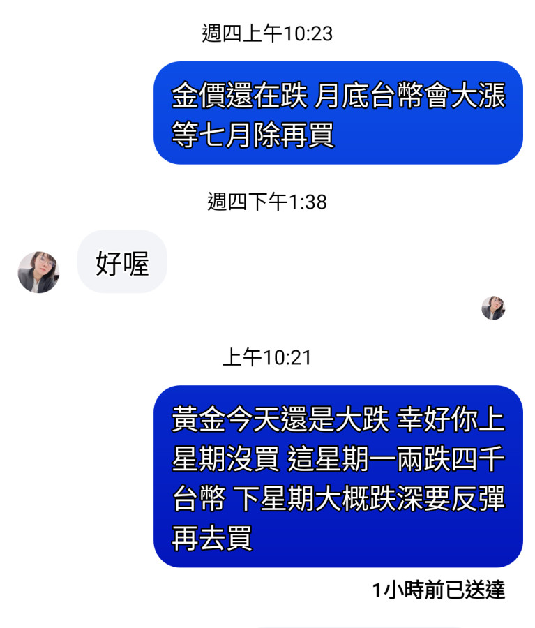 回覆 yesk:上星期我女兒有筆錢進來要買黃金,幸好我叫...