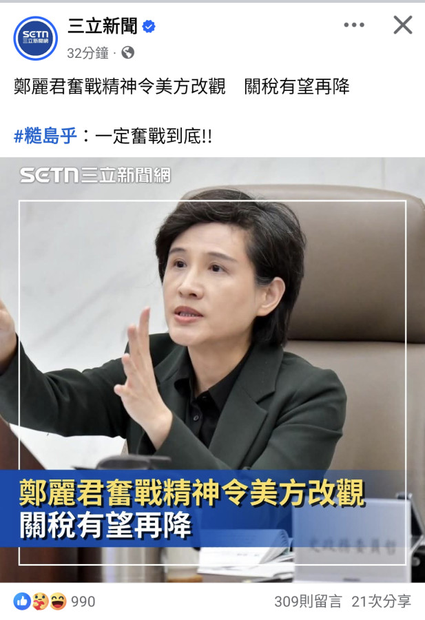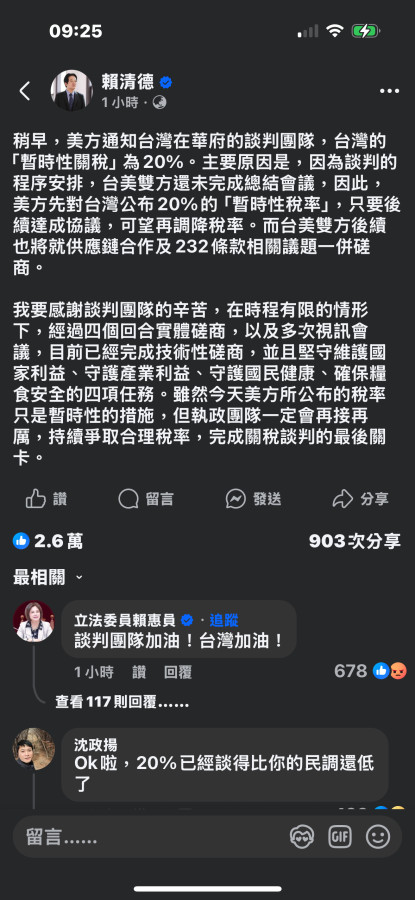 他強調,現在是公開台美貿易談判的時候了,美國關稅從32%降到20%,台灣讓步了什麼?為什麼不是15%,而是20%,「台灣少給了什麼?要取得15%,我們還得貢上什麼?政府在堅持什麼?讓我們一起幫忙談判好嗎?」