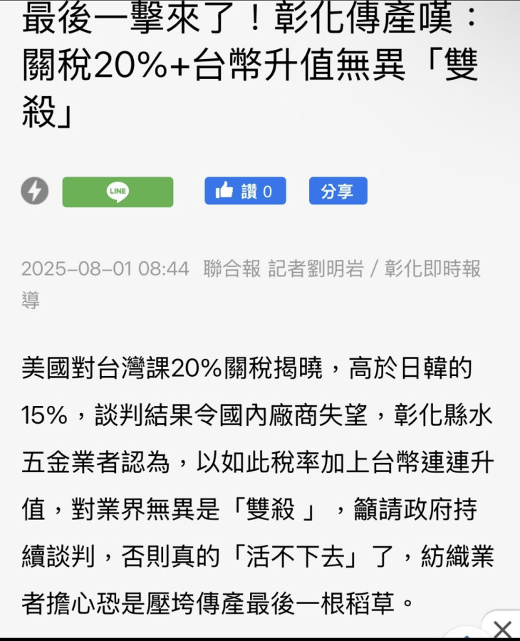 回覆 金鑾寶殿:川普公布對等關稅稅率台灣20%,8月7日...