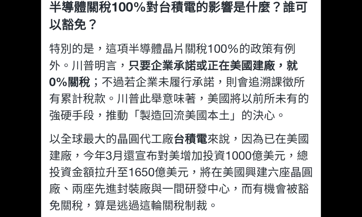 當初台積電若不去美國,台灣可能就是這次關稅貿易最待遇國了,美國最稀缺的就是晶片⋯⋯