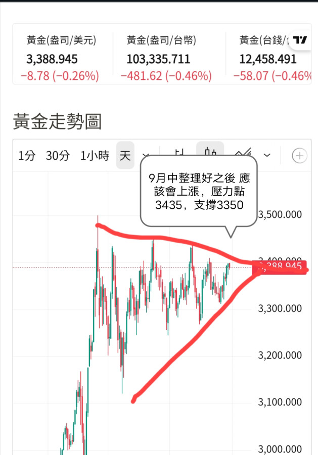 國際黃金價格收斂中,9月初應該會確認方向,剛好FED降息,加上美國的就業率發佈,考慮市場預期,應該8月中會有一個小整理了波。