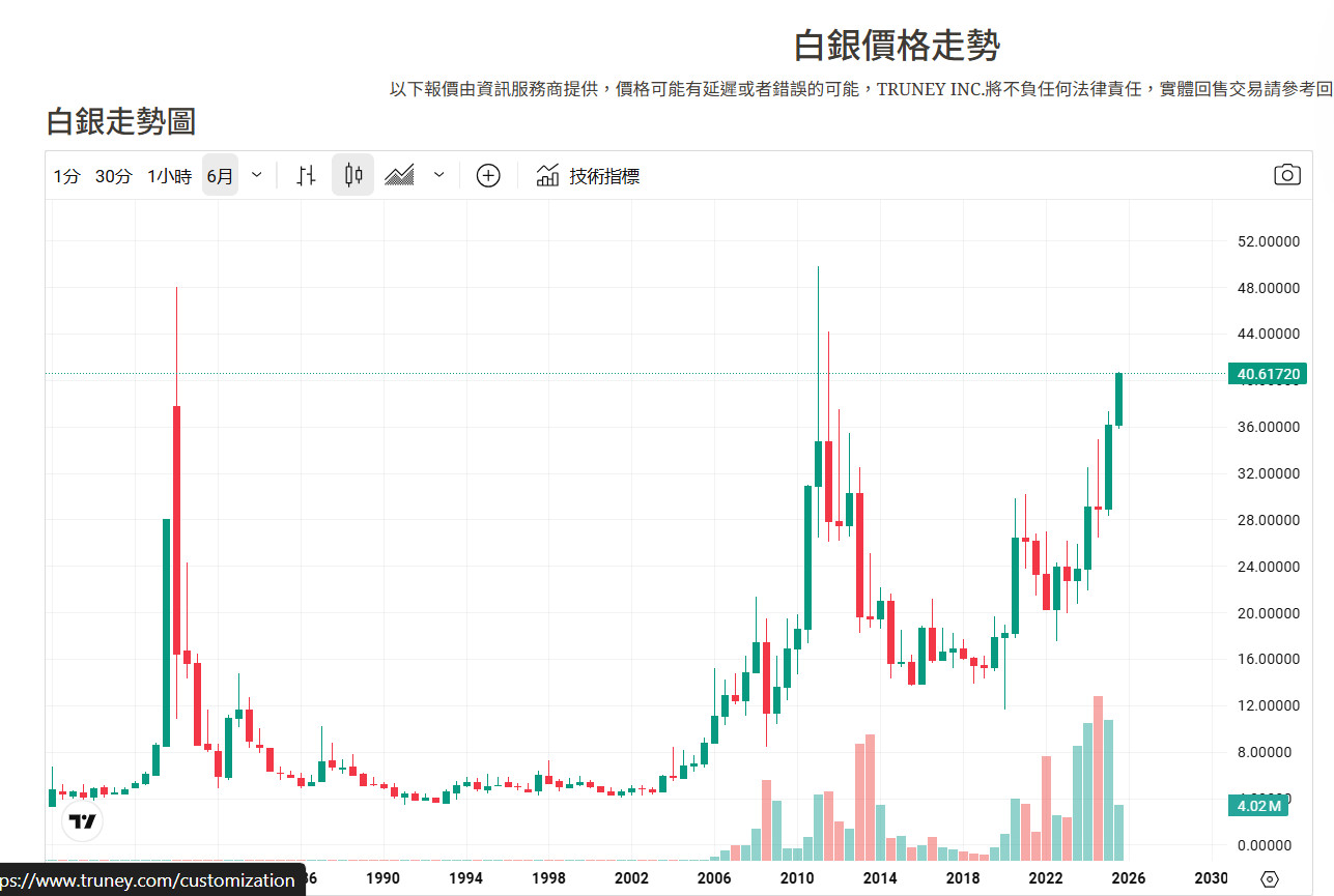 從1970年的低點到2025年的高點,黃金價格上漲了超過9,900%,達到每盎司近3,500美元。此外,從1970年代的低點到2025年的高點,白銀價格上漲了超過3020%,達到近40美元。然而,白銀價格在1980年達到高峰後經歷了深度回調,數十年來一直徘徊在歷史高點附近。同時,黃金價格在過去40年中一直保持強勁的看漲勢頭。