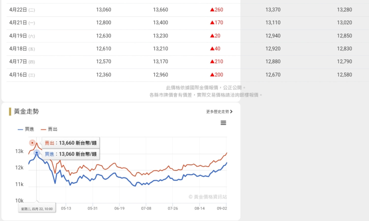 查了一下,最高在4月22日,每錢13660元,現在才每錢13060!