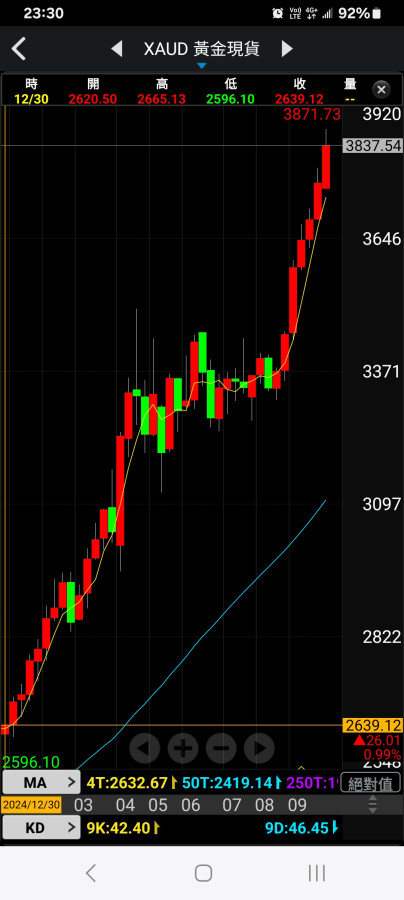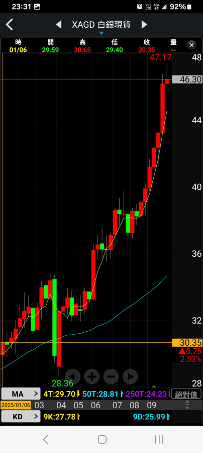 最近學會看月線,只要一回調,就來看一次。今年還沒完就漲這麼多了,吐一點回去又何妨。今天白銀就漲不動了的樣子,黃金則是拉高再殺回。洗一洗盤還是比較健康的。