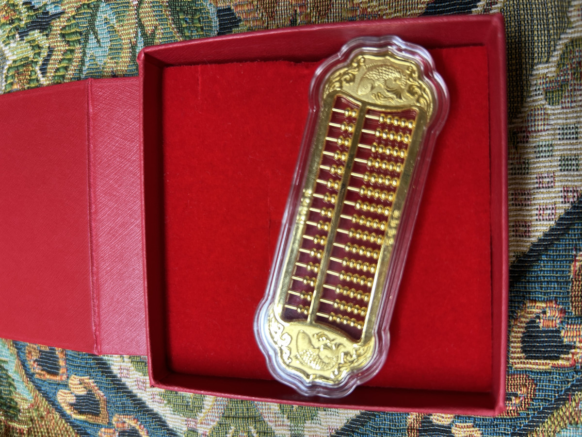 一眼萬年的金算盤,二年多前在朋友開的銀樓飛入眼中後,一直難以忘懷,昨問朋友說賣掉了嗎?她說她收起來了,開心😃,怕再錯過,今天去請回來了,與大家分享一下我的喜悅😁,終於是我的了!