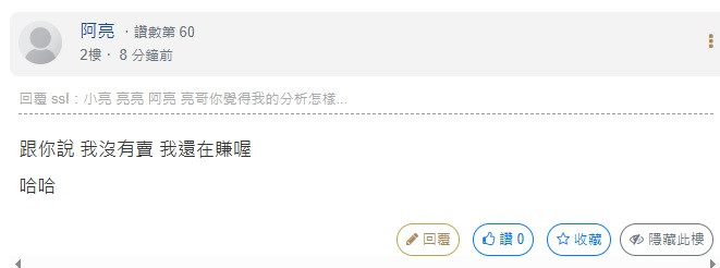 回覆 阿亮:跟你說 我沒有賣 我還在賺喔哈哈...