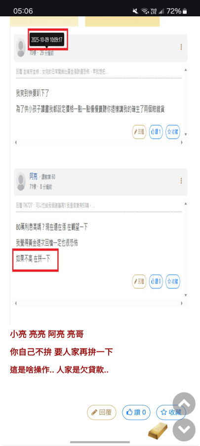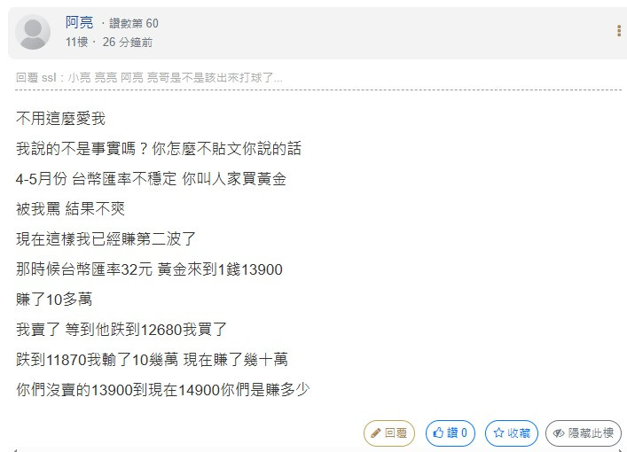 回覆 Angy:自從亮哥抱怨黃金連跌兩個禮拜到32XX....