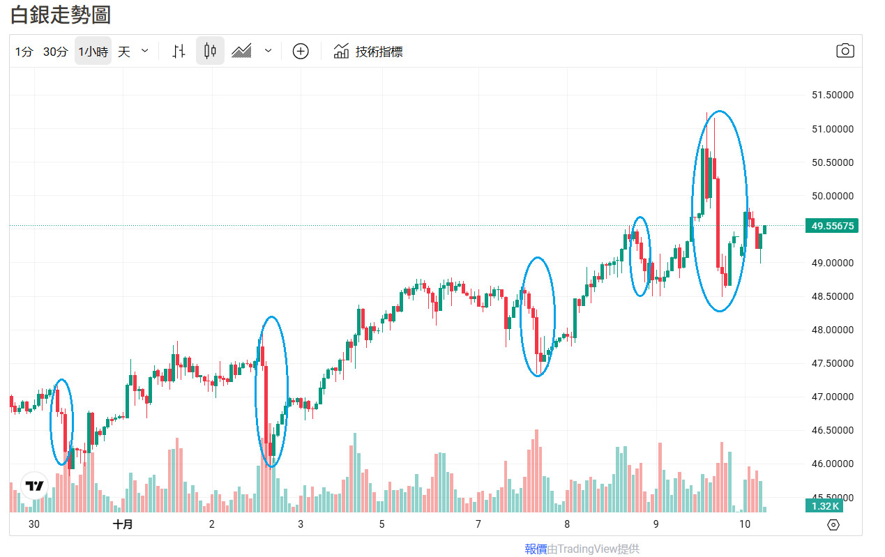 白銀衝破鍋蓋,晚上會更猛,白銀還有兩次盾牌可以擋,三次刀攻擊,來不及太快突破,而反向陣營花了兩次刀,剩下一次刀的攻擊力不夠,很可能會趁白銀站上51元時開始攻擊,真的很刺激