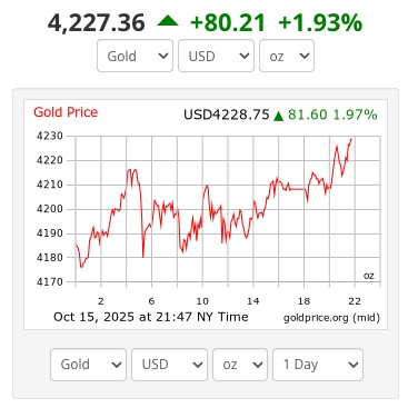 月底降息,中美衝突,俄烏戰事,美國政府關門,各國央行加速買金,美債太高川普善變去美元化.....幾乎都是黃金利多,加上近期世界投入黃金投資機構的資金高升,資金到位尚未補倉完成,黃金狂歡派對進行中,目前重要的是中美談判,如果中國不想談,或者談崩了,金價會沖天,恐慌預期就是金價大漲的助燃劑,金價要反轉等利多因素消除,看中美談怎樣?反正黃金比股票穩定而且想賣就能賣,不會說股票跌停就鎖死,銀樓也不會說,害怕要跌了不收黃金,我常用全球暖化形容金價,將來全球溫度會越來越高,還是變低低,還有黃金開採會越來越多還是會枯竭?亂世買黃金,決定要賣也要留一些保命,不要全賣掉