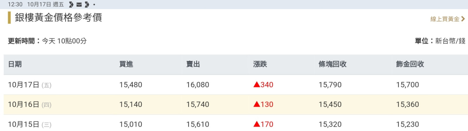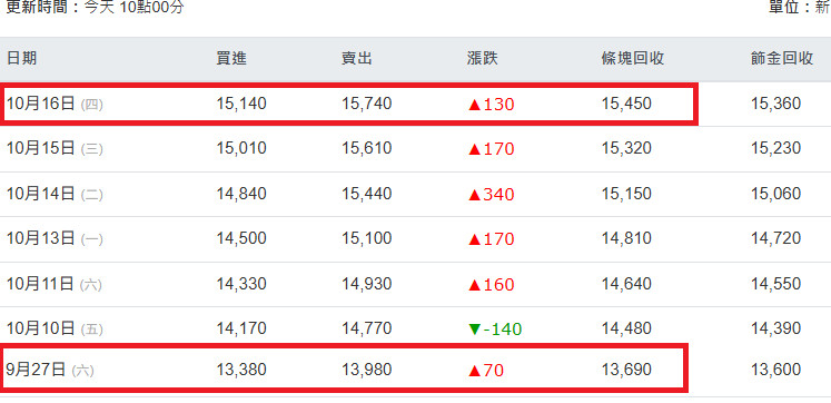 之後為了避免忍不住逢高獲利,直接領出了金條,每天把250g的金條當成文鎮放在電腦螢幕旁,一邊上網一邊把玩,並持續加碼。到今年10月都還繼續買。