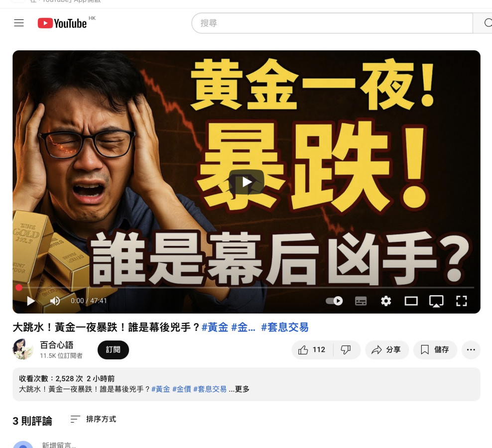剛看YouTube 影片,解釋大跌原因跟預測下周走勢,還有將來看那些指標買賣黃金。供大家參考