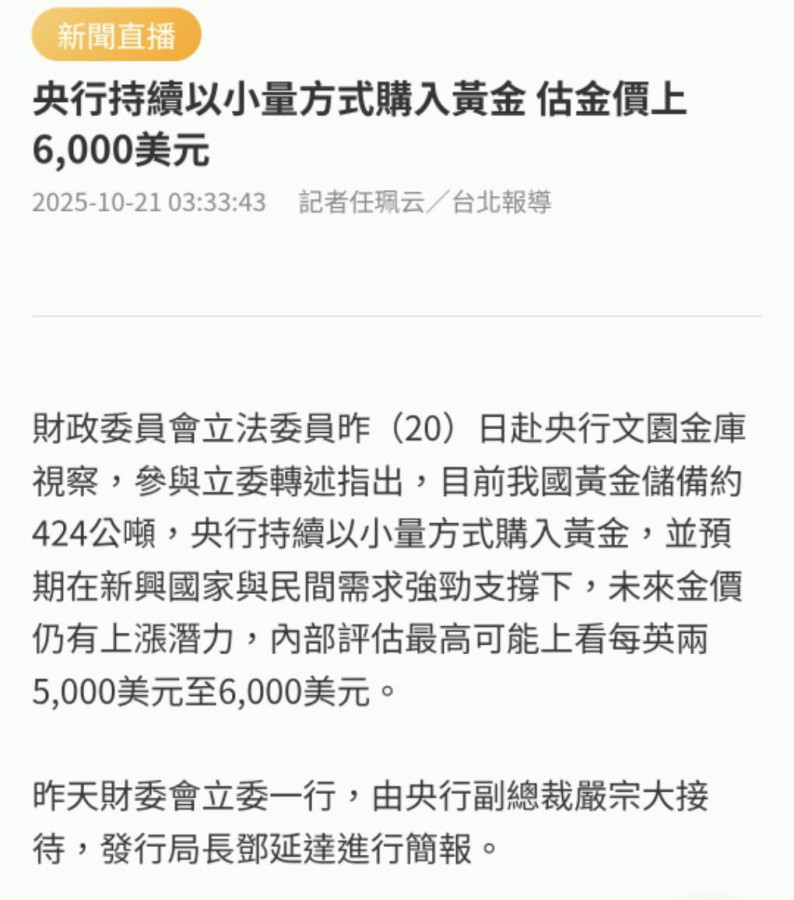 央行預估黃金上看6000