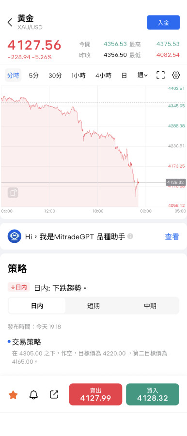 "血流成河!金價較日高一度暴跌近300美元、失守4100美元關口!"