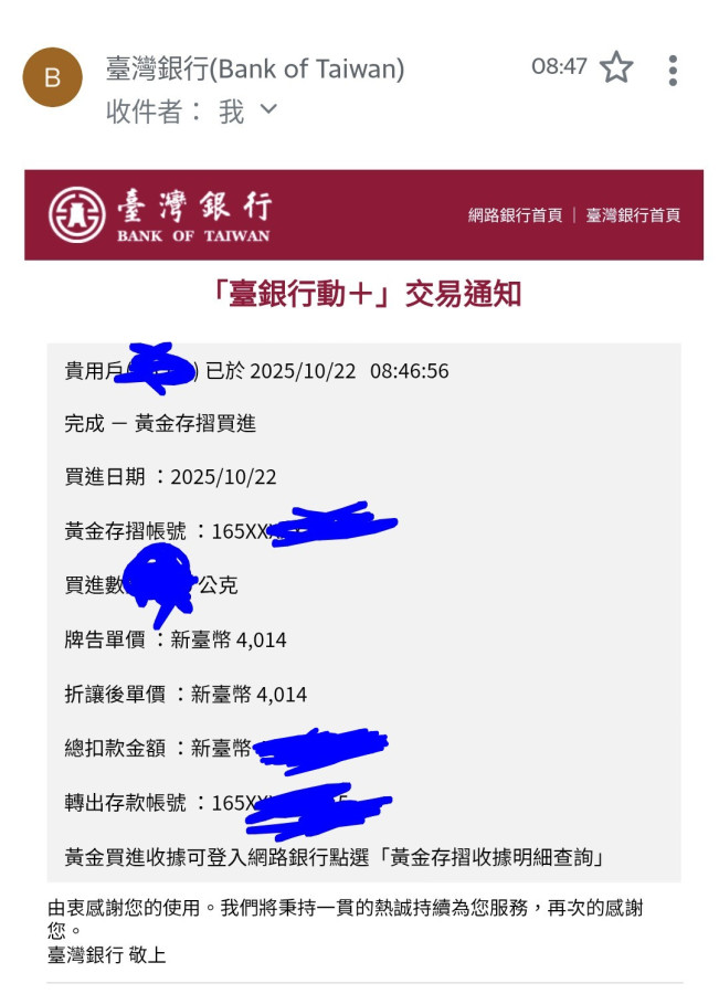 明天繼續加碼一點點,就可以湊足100公克可以換實體黃金,但是不能回售銀行,這個在斟酌一下,還是換1英兩、1台兩?🤣.