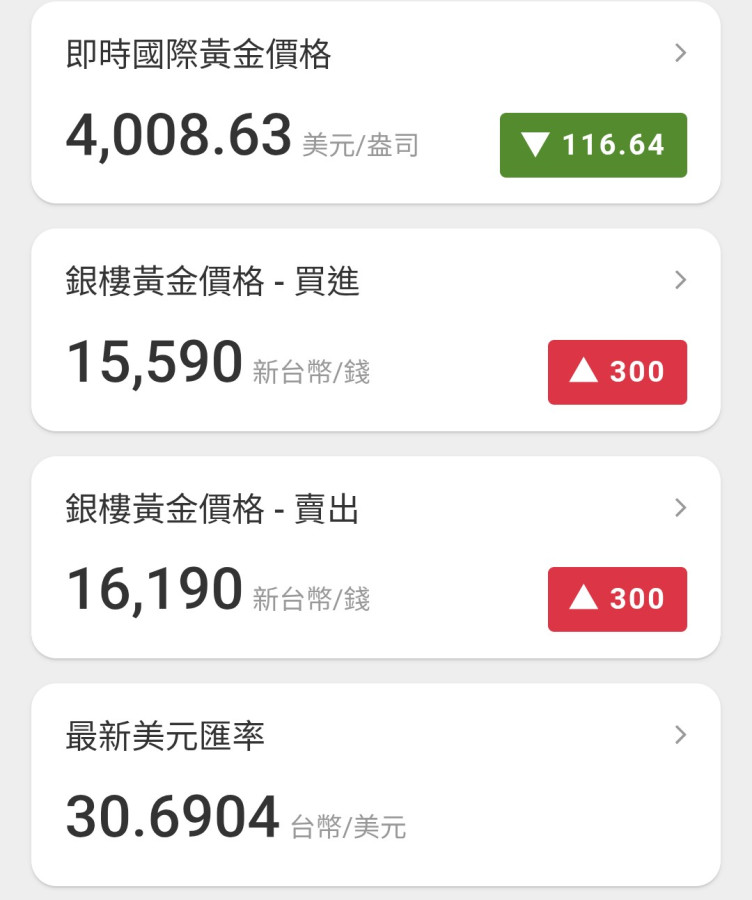 逢低買進勿追高,投資機構喜歡利多聯合殺,再怎麼小心也難防,可惜早上跌到差點破4000不是早上10-11點,銀樓牌價公布時間,不然想去撿便宜,晚點如果漲上4150也會去銀樓買1-2兩漂亮二手金飾,你們習慣上漲一直買,跌了反而不敢買,那個亂幾年的又趁大跌出來嘲笑了!上次3500高點跌破3100,也是亂好久,喊要跌破2600要回2000以下,幾年了幾次了?這次又來了,精神真的有問題。放張早上接近4000的圖