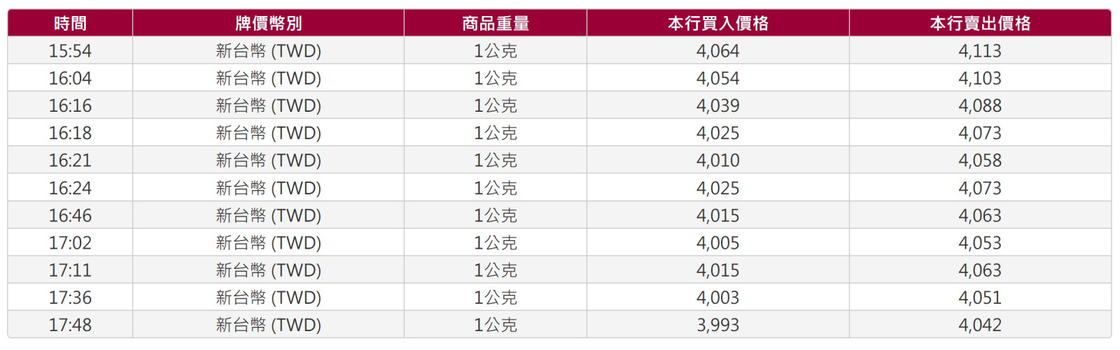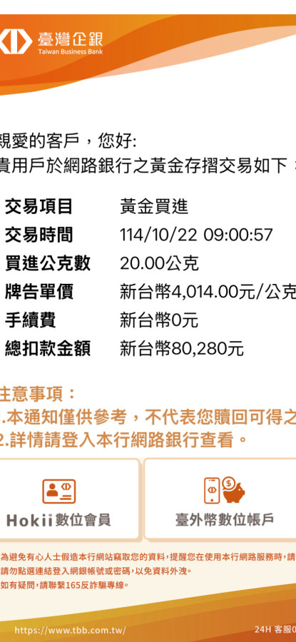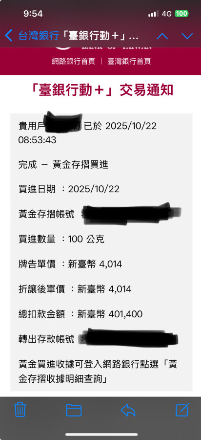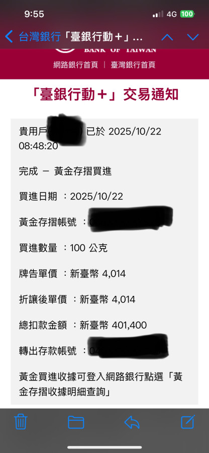 看到黃金大跌,今早8:48及8:53,分別下單100克(401,400元),共200克(802,800元)。
