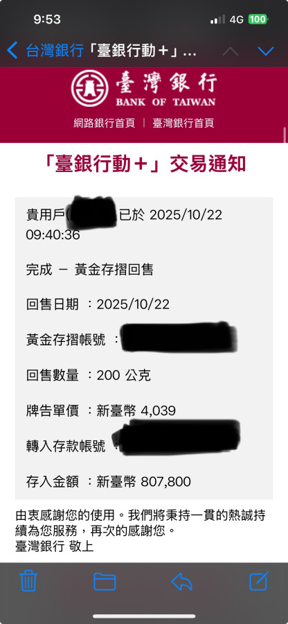 不到一小時,於9:40見風向轉變,拿出手機出金200克(807,800元)。