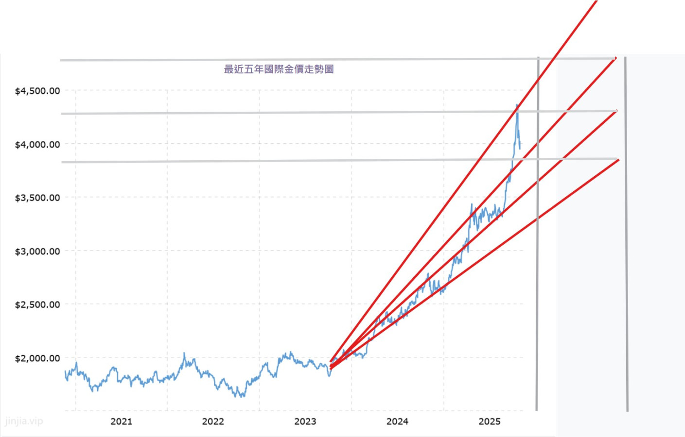第三條線中等偏悲觀,年底跌回3750,2026年破4300元。許多人對於黃金短期過熱而躊躇不前,但已經套牢者也不打算賣出認賠。