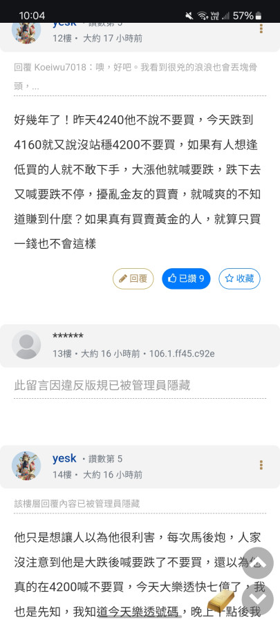 好幾年了!昨天4240他不說不要買,今天跌到4160就又說沒站穩4200不要買,如果有人想逢低買的人就不敢下手,大漲他就喊要跌,跌下去又喊要跌不停,擾亂金友的買賣,就喊爽的不知道賺到什麼?如果真有買賣黃金的人,就算只買一錢也不會這樣
