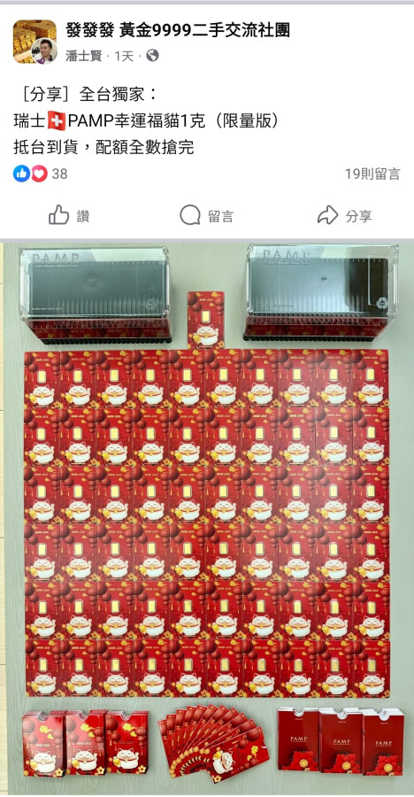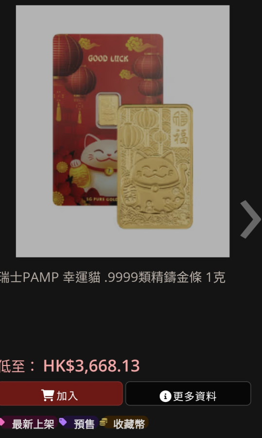 還有一克的。https://www.lpm.hk/zh/1-gram-pamp-suisse-lucky-cat-9999-gold-proof-like-bar.html