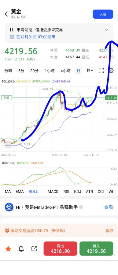 11/28今日金價又爬回4229=約10/21的近一半(4248)
