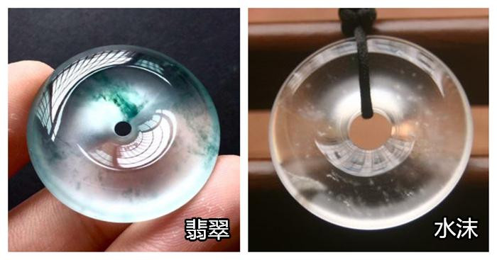 有聴過水沫子嗎?又叫玉髓,翡翠的共生礦的一種。和翡翠九成九像。外行人很難分辨,但他是單晶體結構,打燈可以看到。比重也輕一點。同樣大小的二個材料分別做成平安扣體積。你一上手就可以感受到重量有明顯分別。