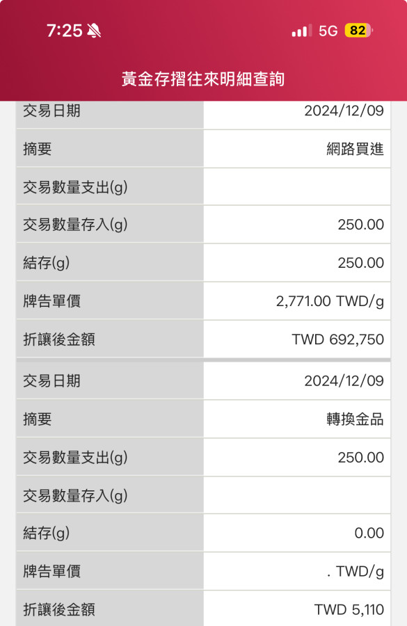 這就是我說的今年以來黃金漲勢陡峭到讓人害怕,怕還存不夠它就要飛升了😅 每年都年終獎金都差不多,但能換的黃金克數那是肉眼可見越來越少啦