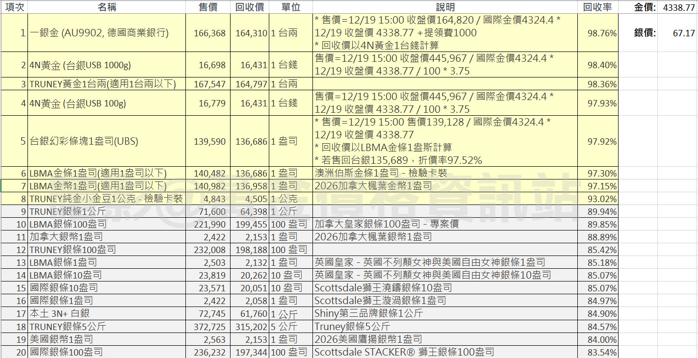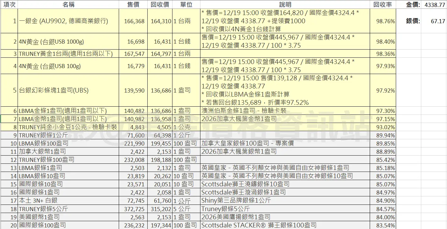 1. 不考慮提領實體金條的時間成本的話,櫃買黃金一銀金(AU9902)是最划算的,回收率98.76%,非常接近台銀黃金條塊1公斤的 98.40%與Truney自有品牌的98.36%,同時又有重量輕、可一次購買一錢、以及直接在股票市場售出 (回收率 99.68%) 的彈性。不過此價格是以19號下午三點最後的收盤價,參考之後國際收盤價再予以調整,所以可能有誤差,僅供參考。