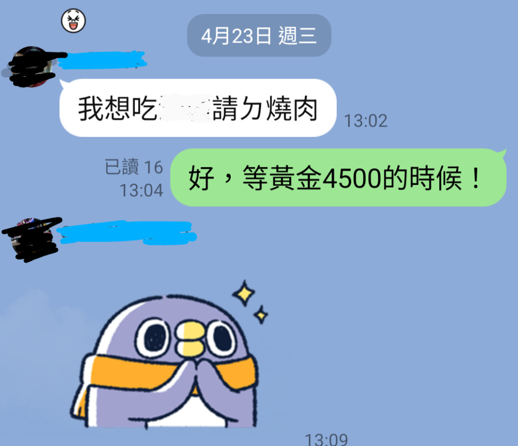 我在4/23買進黃金不久之後,因為台幣對美元狂升值,金價從每克3600元瞬間跌到3100,當時還被朋友調侃。我就說,等金價上到4500就請大家(大概十幾個人)吃燒肉。