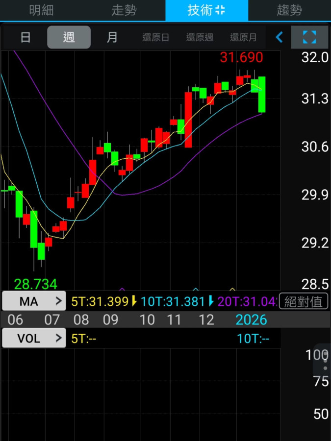 可能是顯示的文字是「明細 走勢 勢 日 週 技術キ 月 31 31.690 690 32.0 31.3 30.6 29.9 29.2 28.734 MA > 07 VOL 06 > 5T:31.399 10T:31 10T:31.381 381 20T:31.04 08 09 1011 10 11 2026 5T:-- 10T:-- 28.5 絕對值 12 100 75 50 」的圖像