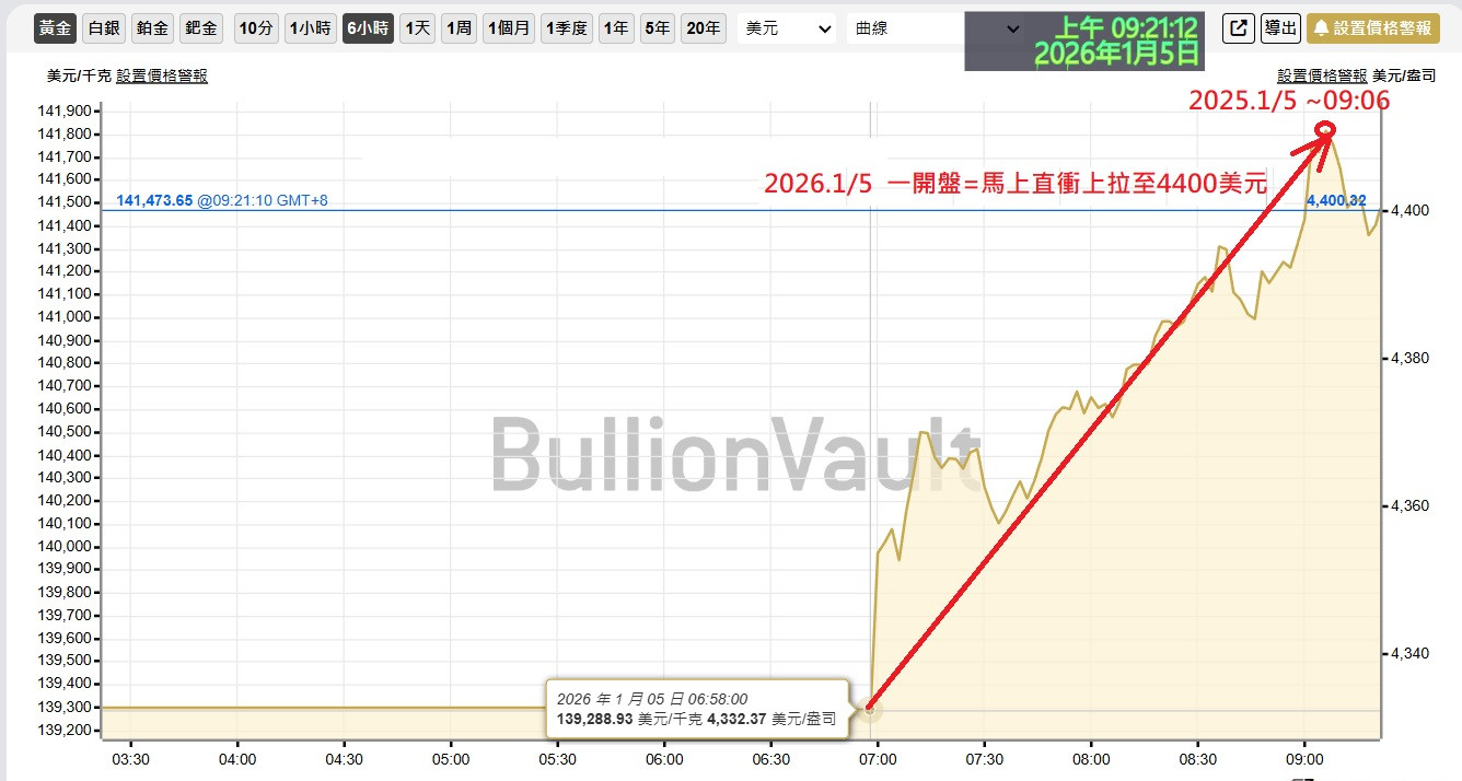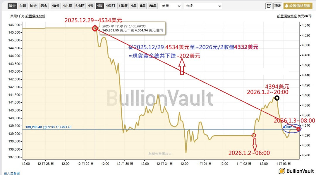 延伸至2026.1.3~6:00收盤價格=現貨黃金價=4332美元/盎司